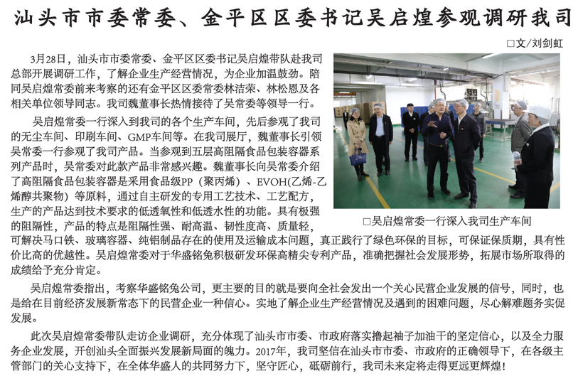 Wu Qihuang, the member of Shantou Municipal Committee and the Secretary of Jinping District Committee, visited and investigated our company
